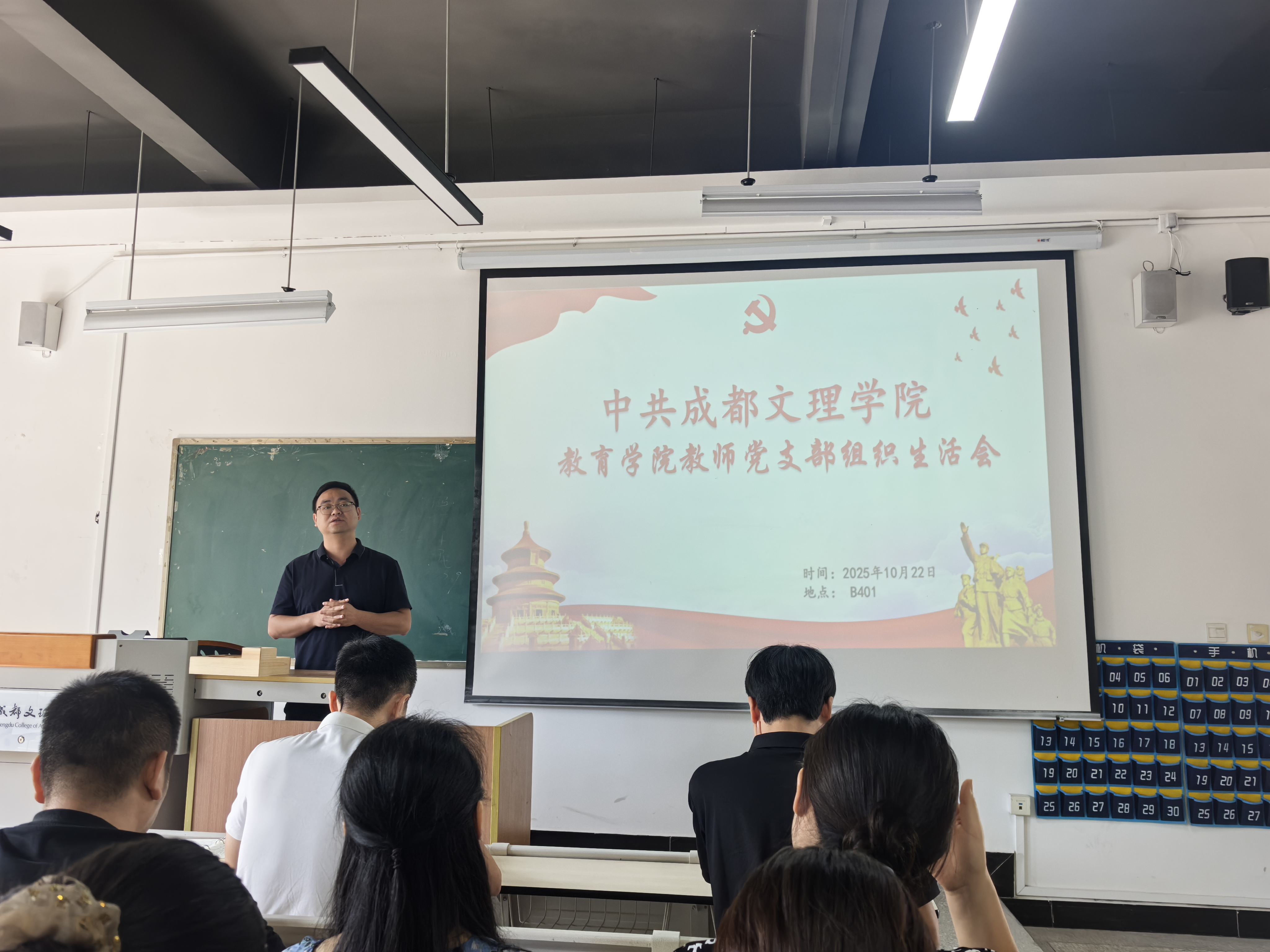 2025年10月22日,成都文理学院教育学院教师第一党支部在B401教室召开10月组织生活会,持续深化抗战精神学习,聚焦“学讲话、谈感悟、践行动”,推动理论学习成果向育人实践转化,党支部全体教师参加会议。