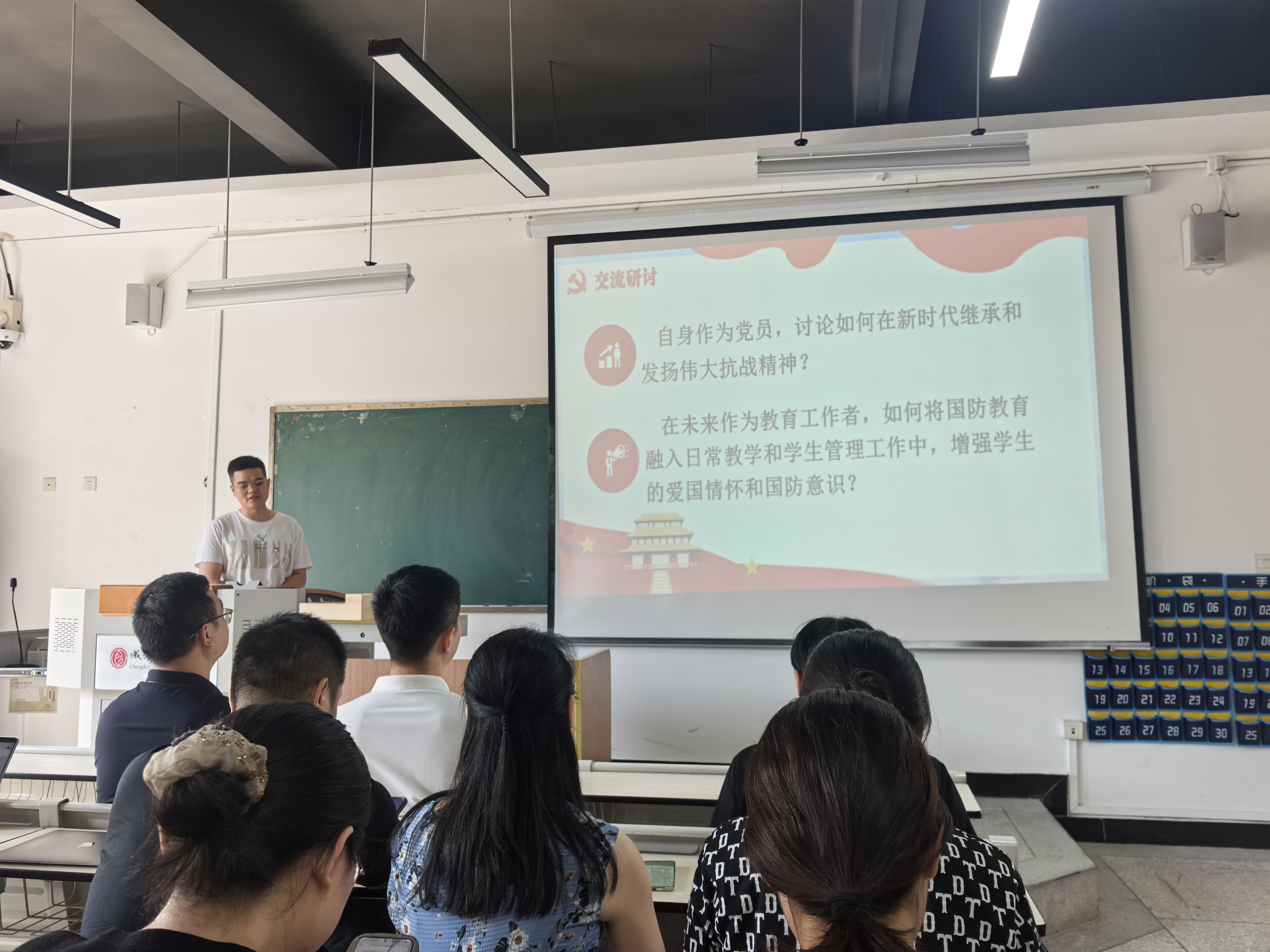 在交流研讨环节,党员们结合教师身份展开热烈讨论。围绕“新时代如何继承发扬伟大抗战精神”,大家提出要将抗战精神融入师德师风建设,以“不畏艰难、敢于斗争”的态度攻克教学科研中的难题;针对“如何将国防教育融入日常教学与学生管理”,则明确要在课堂教学中挖掘抗战历史素材,在学生活动中开展国防知识宣讲,引导学生增强爱国情怀与国防意识,厚植“强国有我”的责任担当。