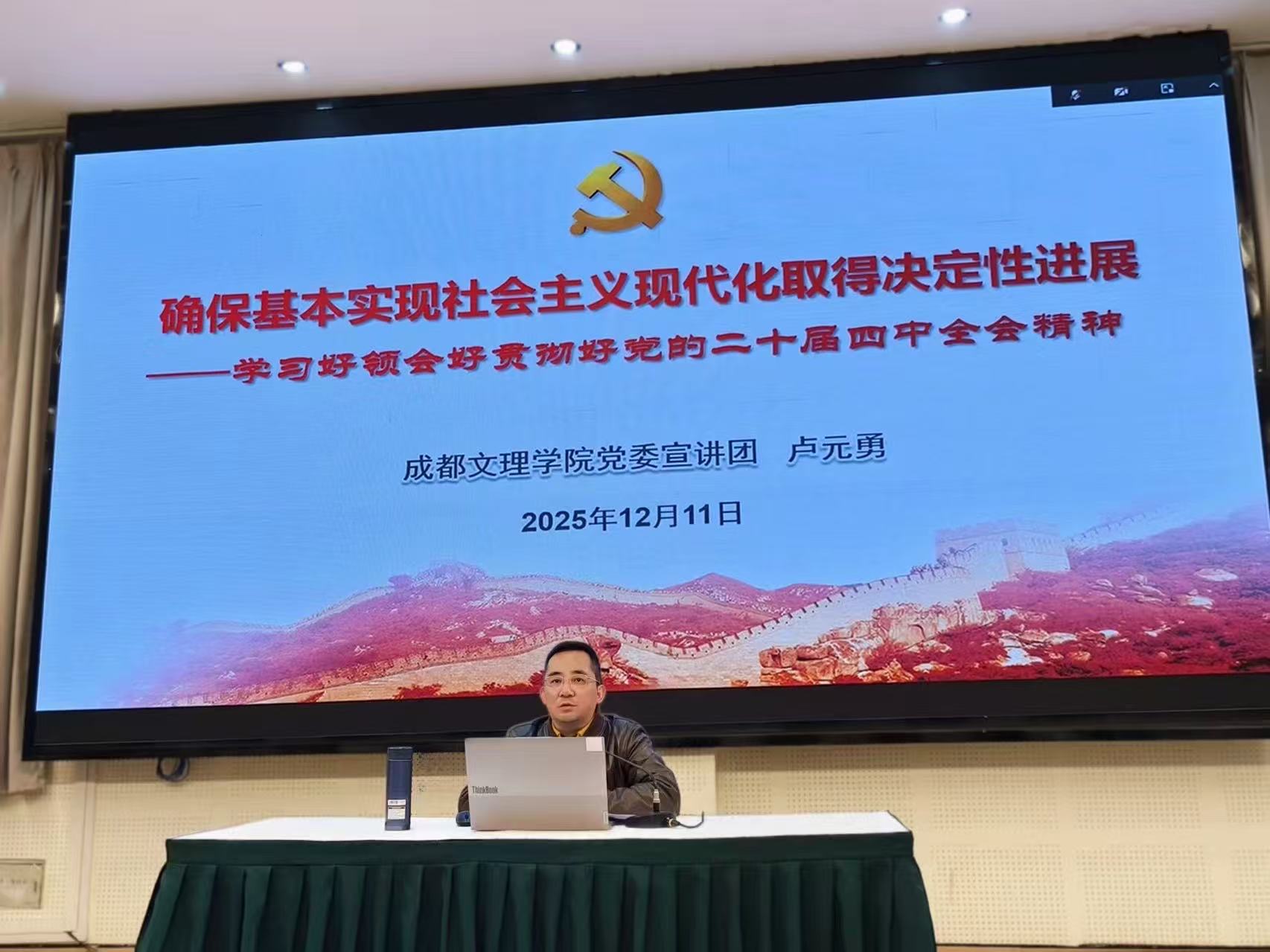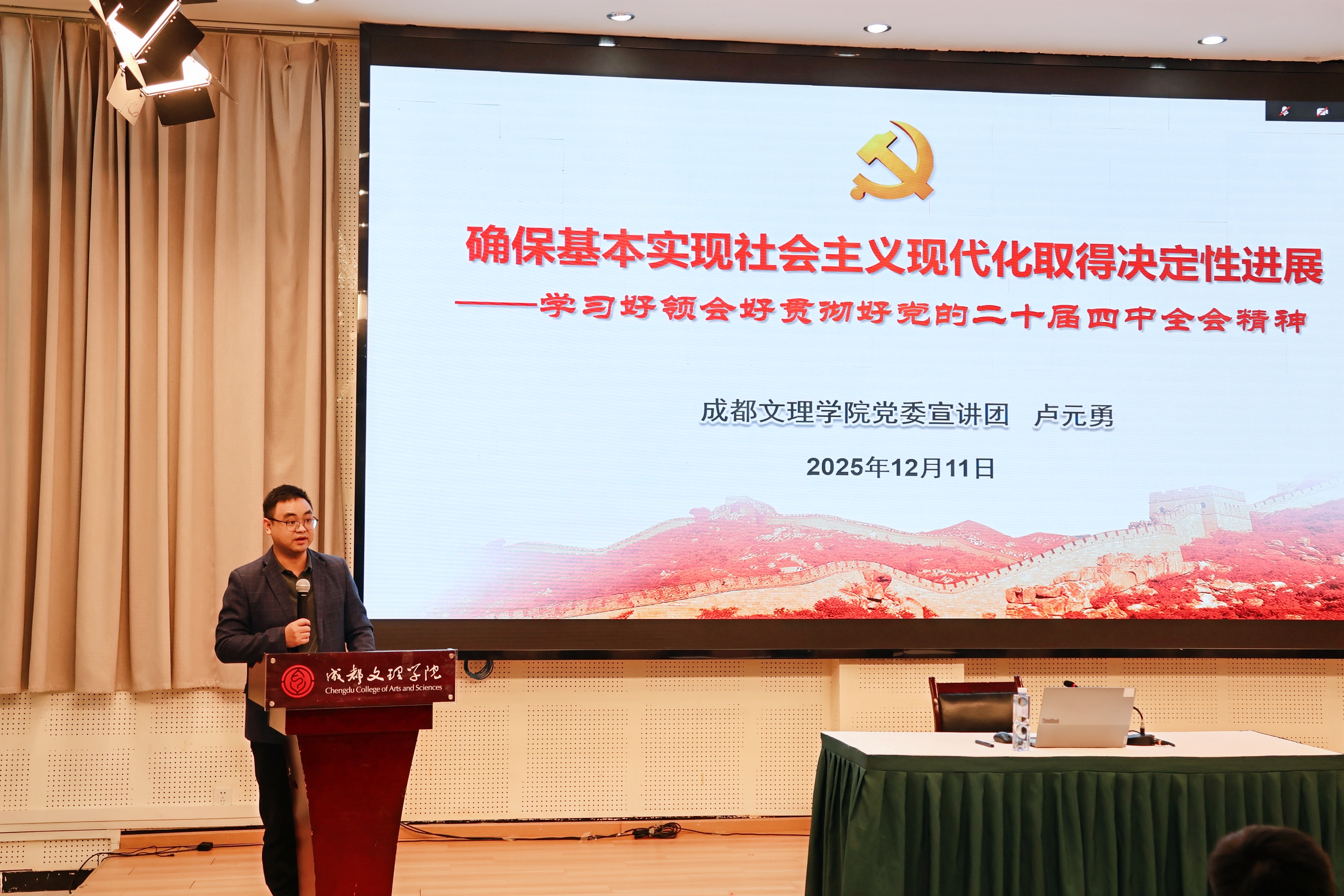 12月11日下午,学校党委宣讲团在教育学院宣讲党的二十届四中全会精神。学校党委副书记、工会主席卢元勇同志作宣讲报告。教育学院党委书记舒彪主持报告会。学院党委班子成员、全体师生党员和非党员师生代表参加。