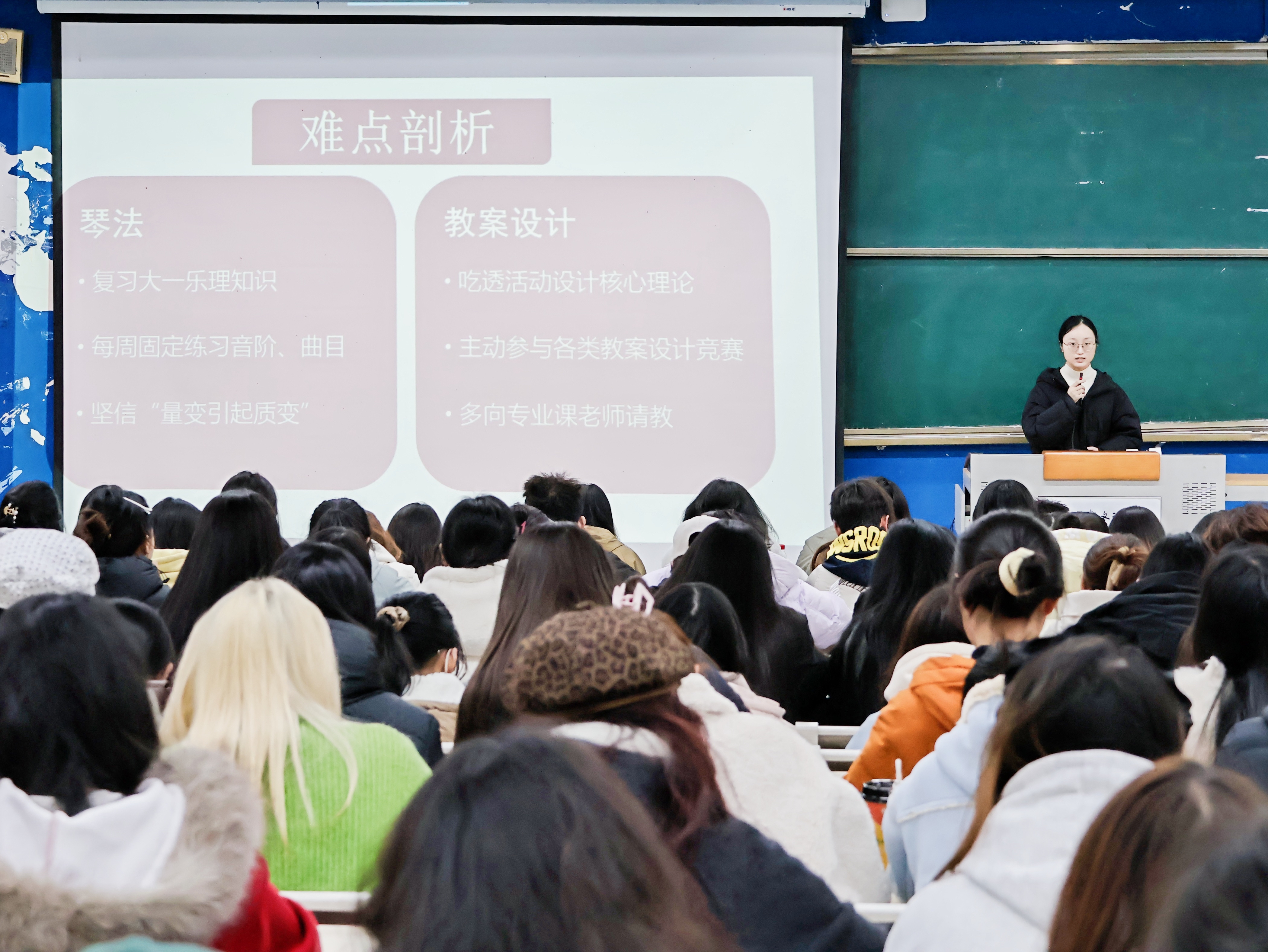 为充分发挥优秀学子的榜样引领与示范带动作用,搭建朋辈深度交流平台,助力学生明晰学业方向、提升综合素养,11月26日,“以榜样为炬,启成长之路”教育学院国家奖学金获得者经验分享会在主教C114举行。教育学院党委副书记兼学工办主任肖媛、学生第三党支部书记潘临锋、分团委书记毛玮、辅导员蒋丽,学前教育和早期教育专业各班级学生代表参与。