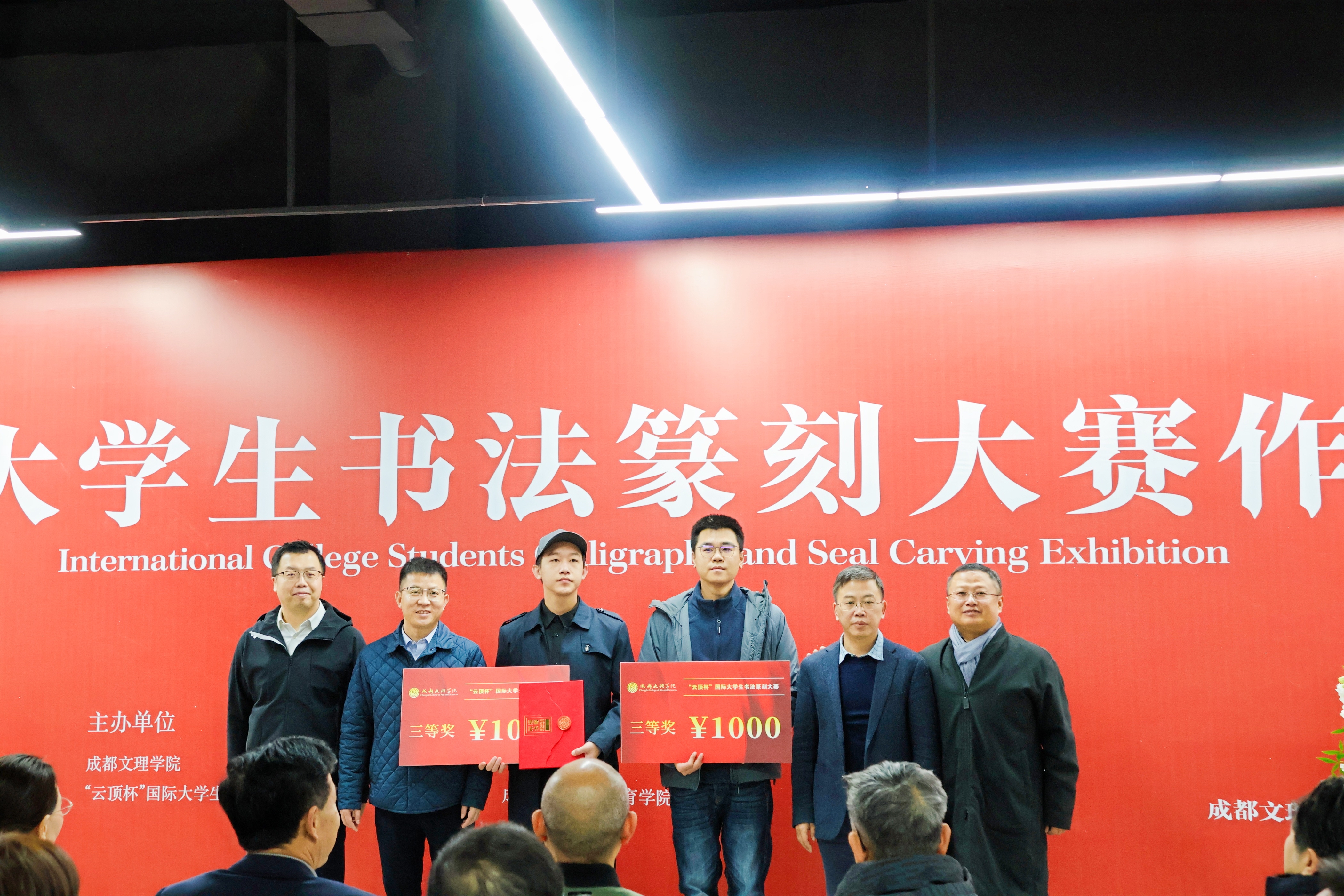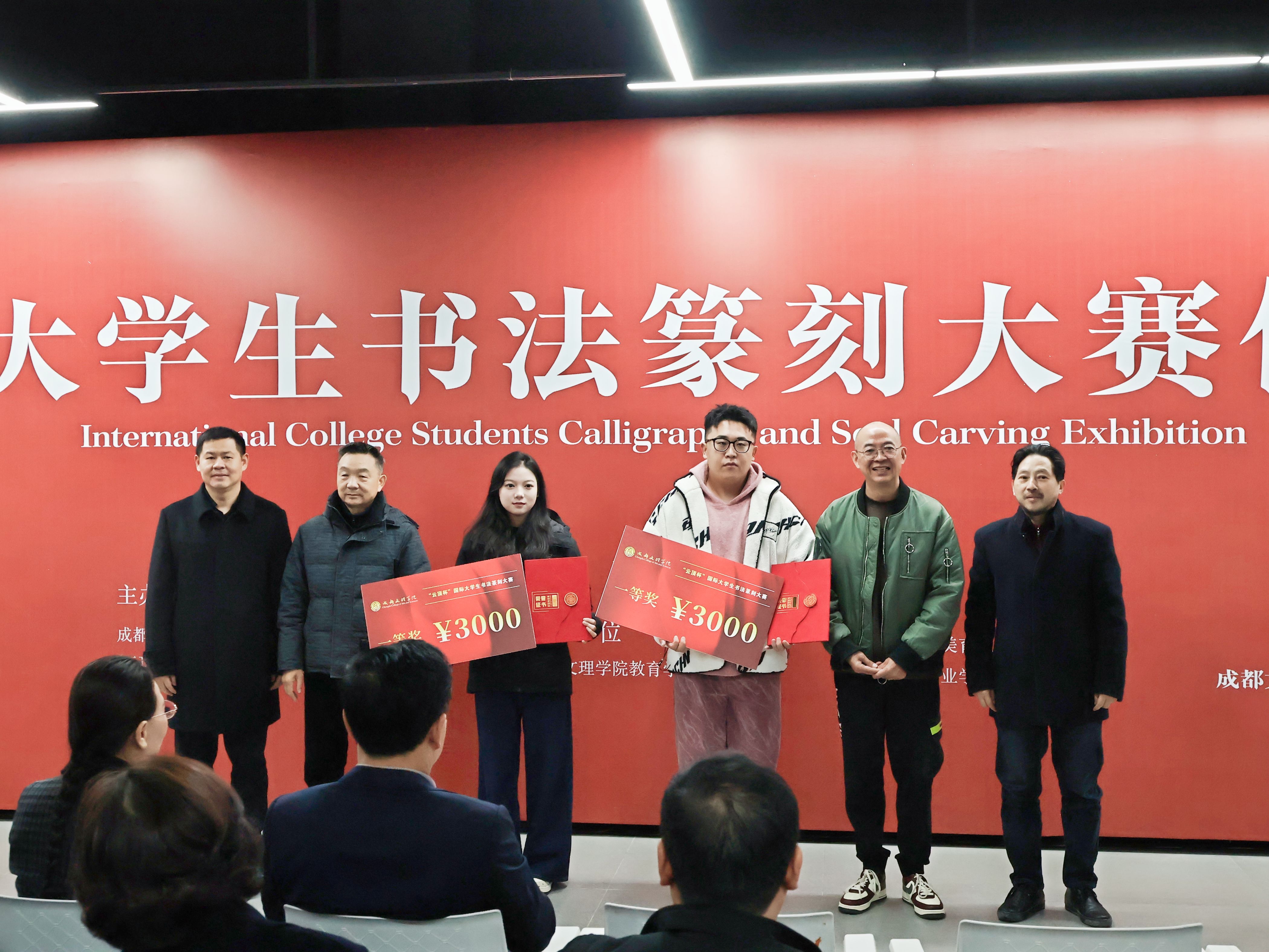 四川省书法家协会副主席、理论委员会主任、成都中医药大学教授王家葵,南京航空航天大学教授、硕士生导师邱世鸿,山东艺术学院、四川大学教授、博士生导师吕金光,成都文理学院党委副书记、常务副校长童精明为一等奖获奖代表颁奖。