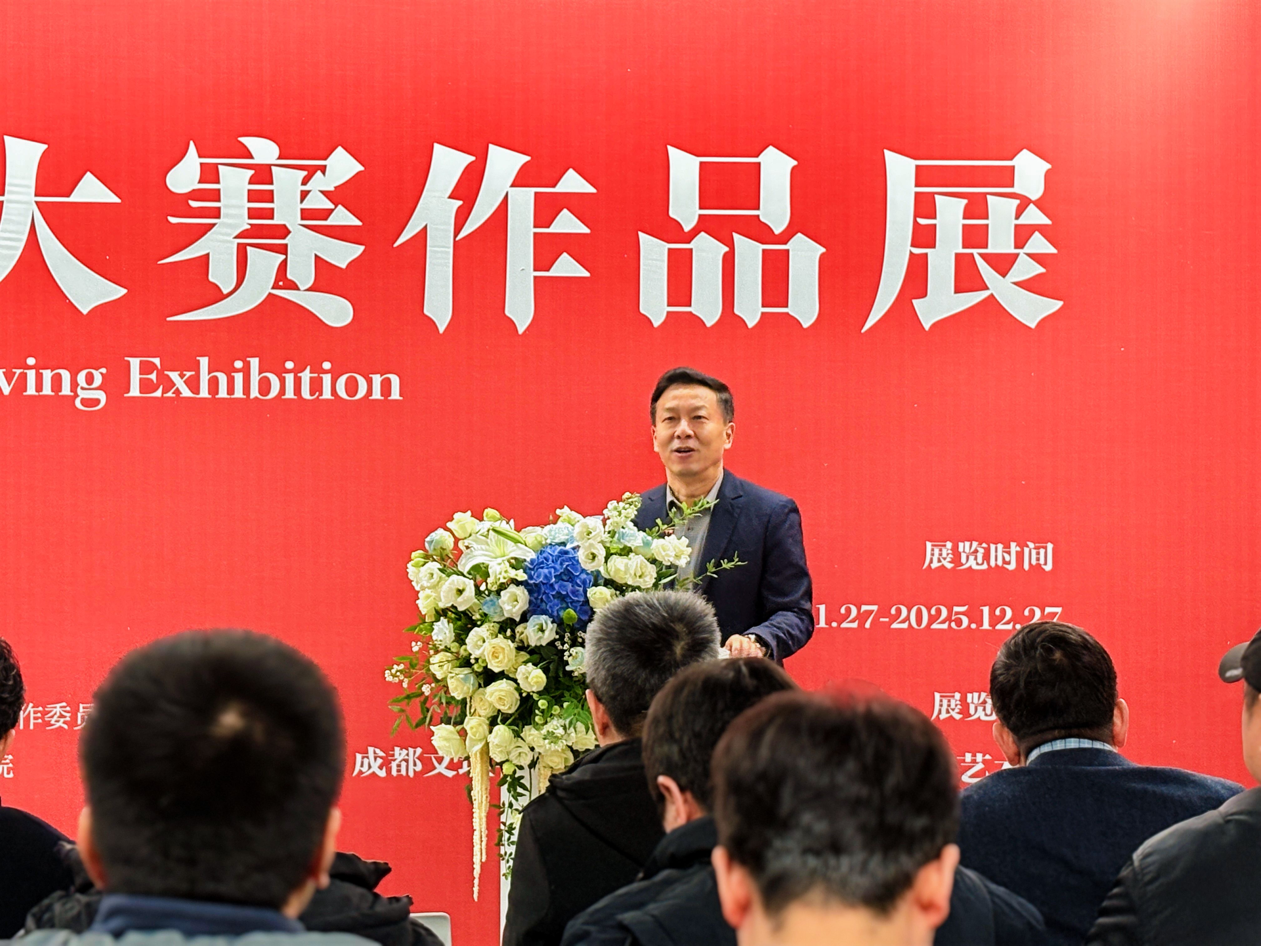 四川省书法家协会副主席王家葵开幕式上致辞。他表示首届“云顶杯”的启幕恰是青年与传统艺术的美好相逢。他强调,书法篆刻是承载千年文脉与民族精神的文化瑰宝,此次大赛以笔墨为桥、金石为媒,既彰显了高校深耕美育的责任担当,更让海内外青年学子在此共探传统艺术的创新表达;他还强调,未来将持续深化校地合作,为青年搭建更多交流展示平台,助力书法篆刻艺术在新时代焕发蓬勃生机,并预祝大赛圆满成功、青年学子前程似锦。
