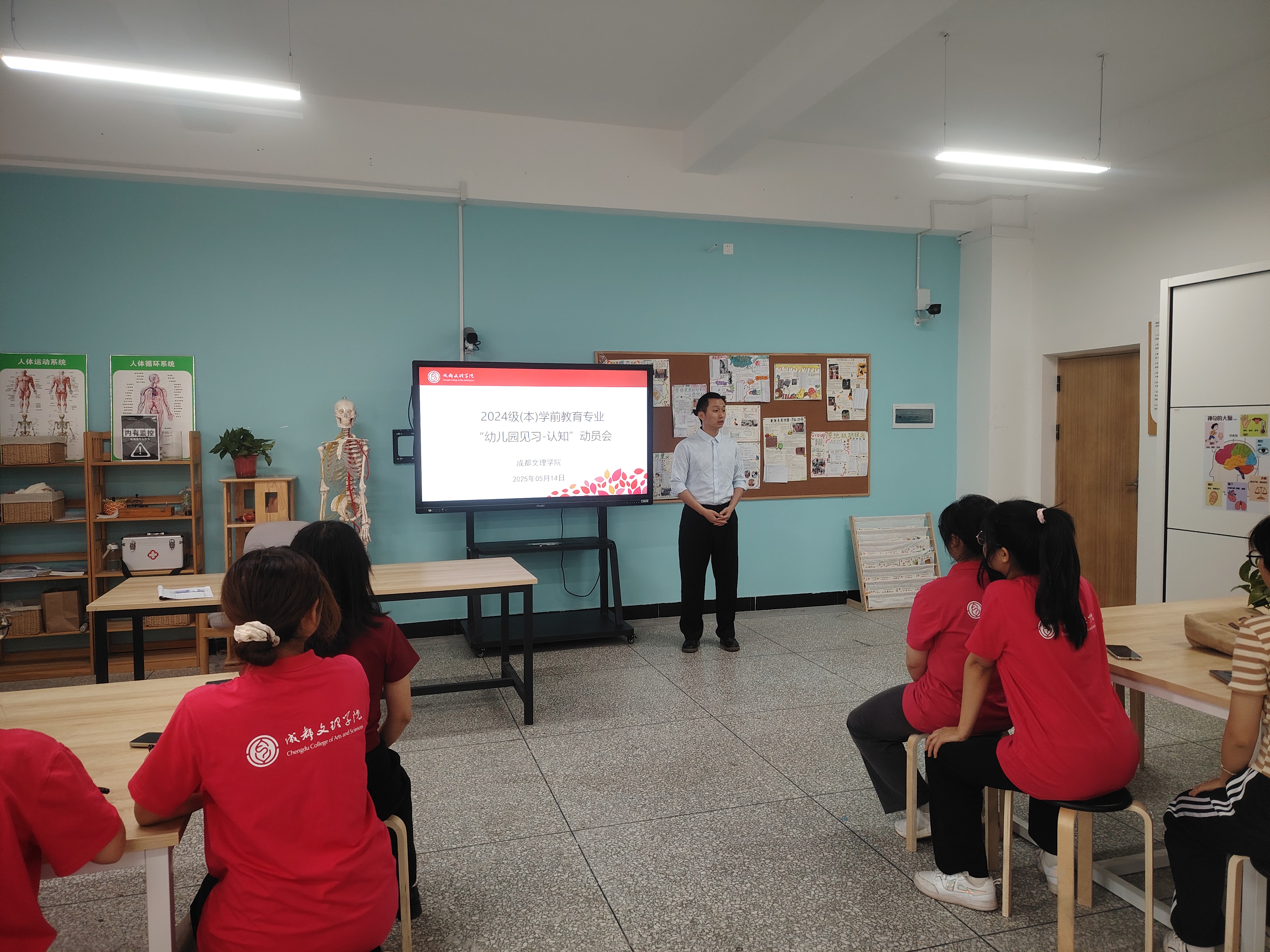 2025年5月14日,2024级学前教育本科一班于A202教室举行了“幼儿园见习-认知”动员会。本次会议旨在帮助同学们更好地了解即将开始的幼儿园见习工作,明确实习目标,提升实践能力。本次动员会由学前教育教研室组织,教研室主任陈芸老师、朱海鸣老师和李云华老师出席会议并进行相关指导。