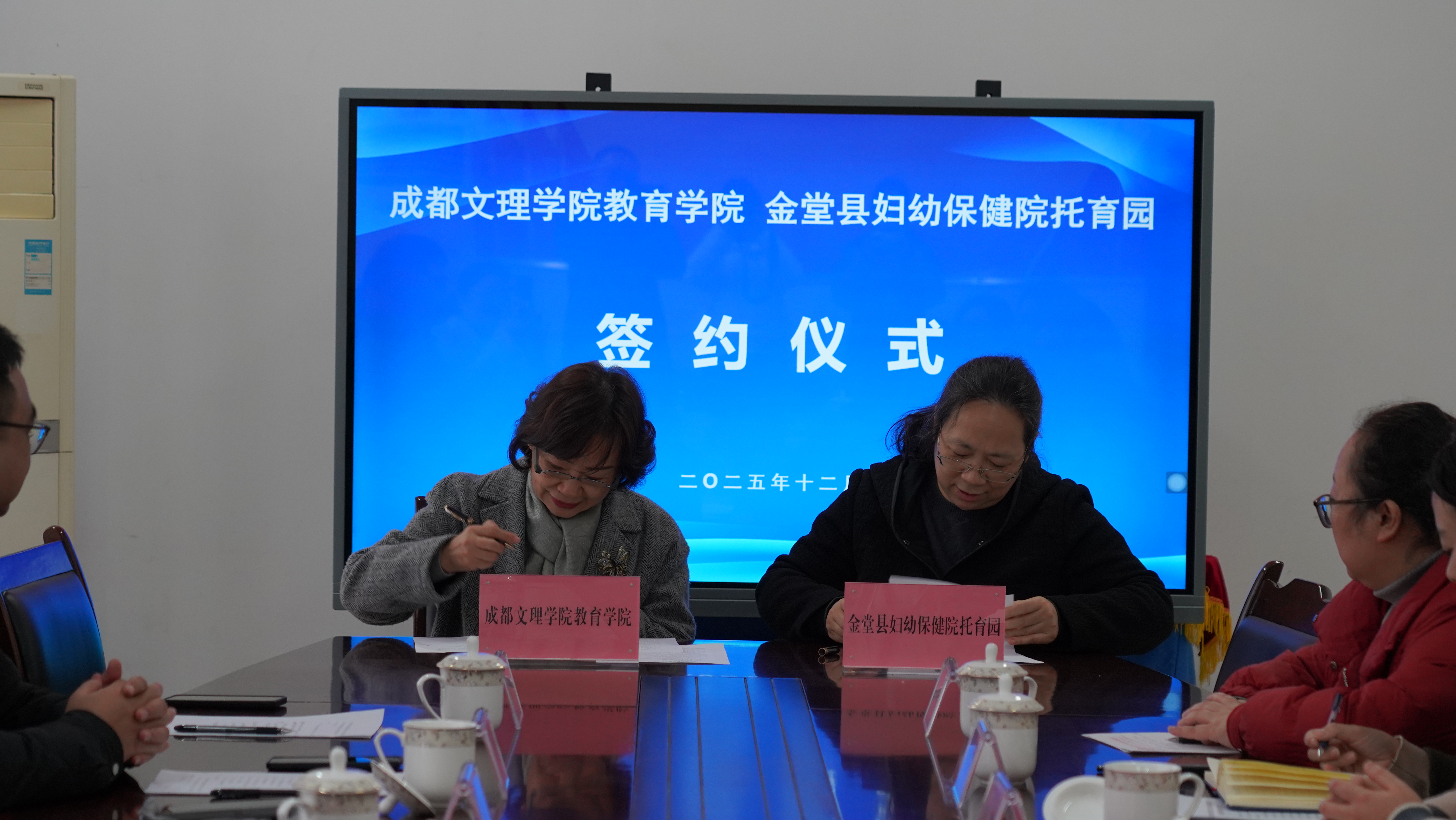 在双方代表的共同见证下,卢伟院长与金堂妇幼保健院托育园负责人正式签署合作协议,并授予其“成都文理学院教育学院实践教学暨就业基地”牌匾。