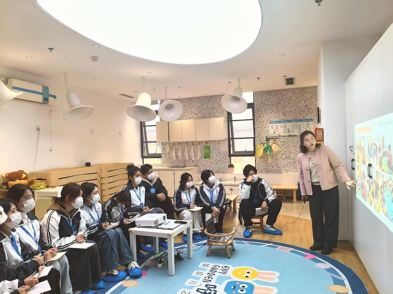 当日上午,咿薇婴幼儿之家园长热情接待了见习师生,在接待室召开专项启动会,详细解读见习流程、安全规范及师幼互动核心原则,强调托育工作“严谨细致、以幼为本”的核心要求。随后,园长带领师生参观园区环境,色彩柔和的教学区、分类有序的益智教具与绘本、安全完备的户外活动设施、适配幼儿身高的生活区域,全方位展现了园区“以幼儿发展为中心”的办园理念,让学生直观感受托育机构环境创设的科学性与人文关怀。