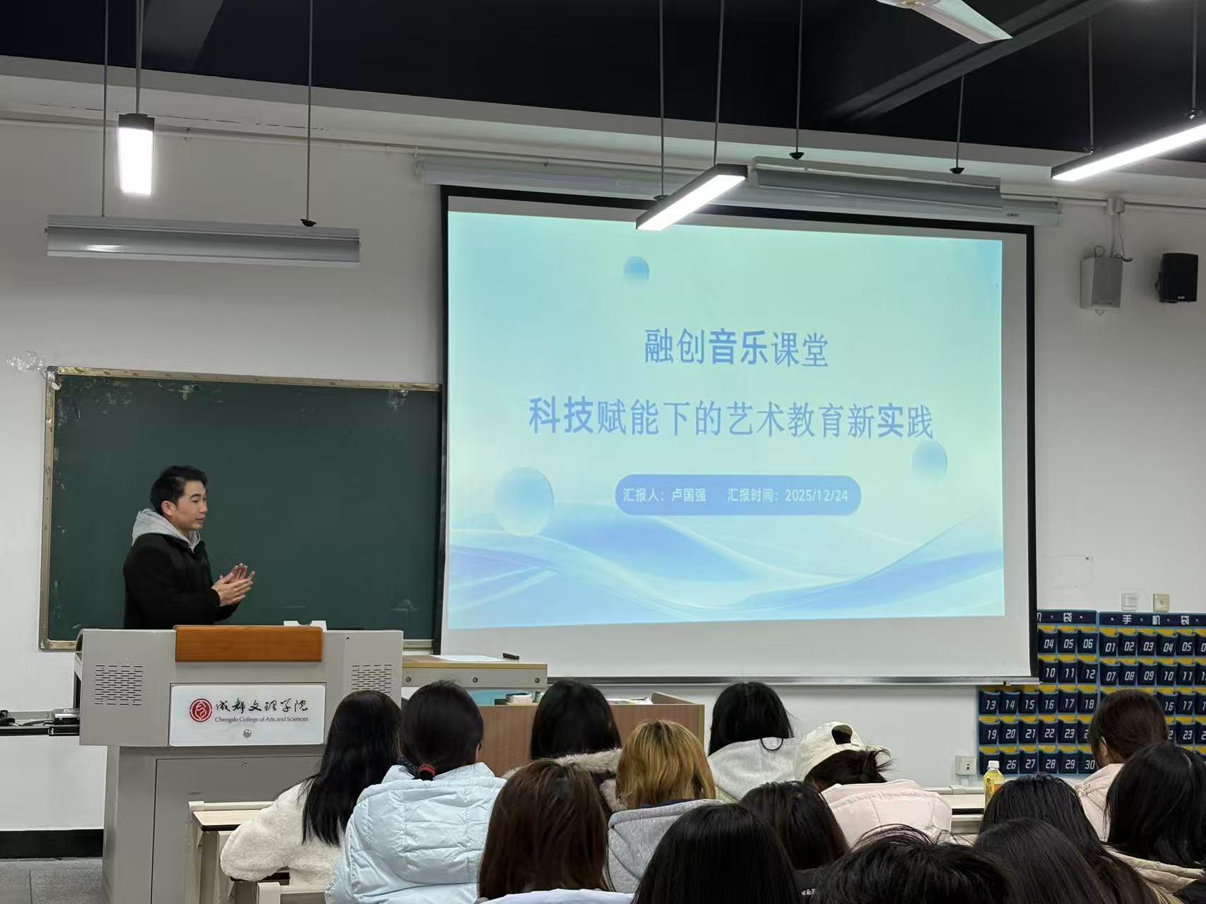 为推动艺术教育与科技的深度融合,助力艺术教育专业学子拓宽专业视野、夯实教学实践能力,12月25日18:30,成都文理学院教育学院在B401教室举办“融创音乐课堂:科技赋能下的艺术教育新实践”专题讲座。本次讲座特邀奥尔夫音乐教学法一级培训师、成都文理学院讲师卢国强担任主讲人,2025级艺术教育本科大一新生等众多学子到场聆听。