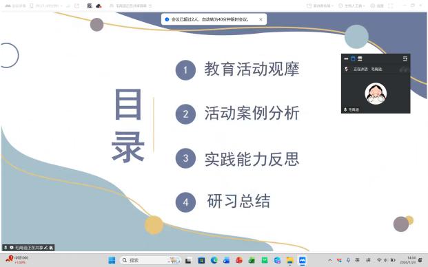 为总结教育研习成果、深化教育认知,促进师范生专业成长,2026年1月23日,成都文理学院2022级学前教育本科教育研习汇报分享会顺利召开。本次会议由学前专职教师吴胜、杨紫萱全程指导,全体教育研习生齐聚云端,共同分享教育研习感悟、交流研习收获。