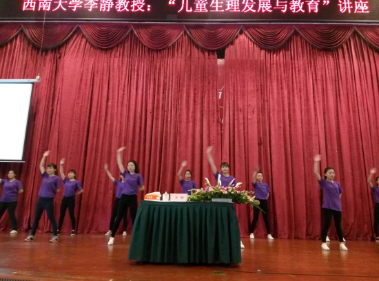 5月3日上午9时,学术周期间第一场学术讲座在我校文理大讲堂如期举行。本次讲座特地邀请到了西南大学学前教育专家李静教授为大家带来《儿童生理发展与教育》的专题讲座。出席本次讲座的有教育学院卢院长、学前教育专职教师、教学秘书以及辅导员,此外学前教育专业学生400余人参加了此次讲座。讲座在两支欢快的律动表演中拉开了序幕。