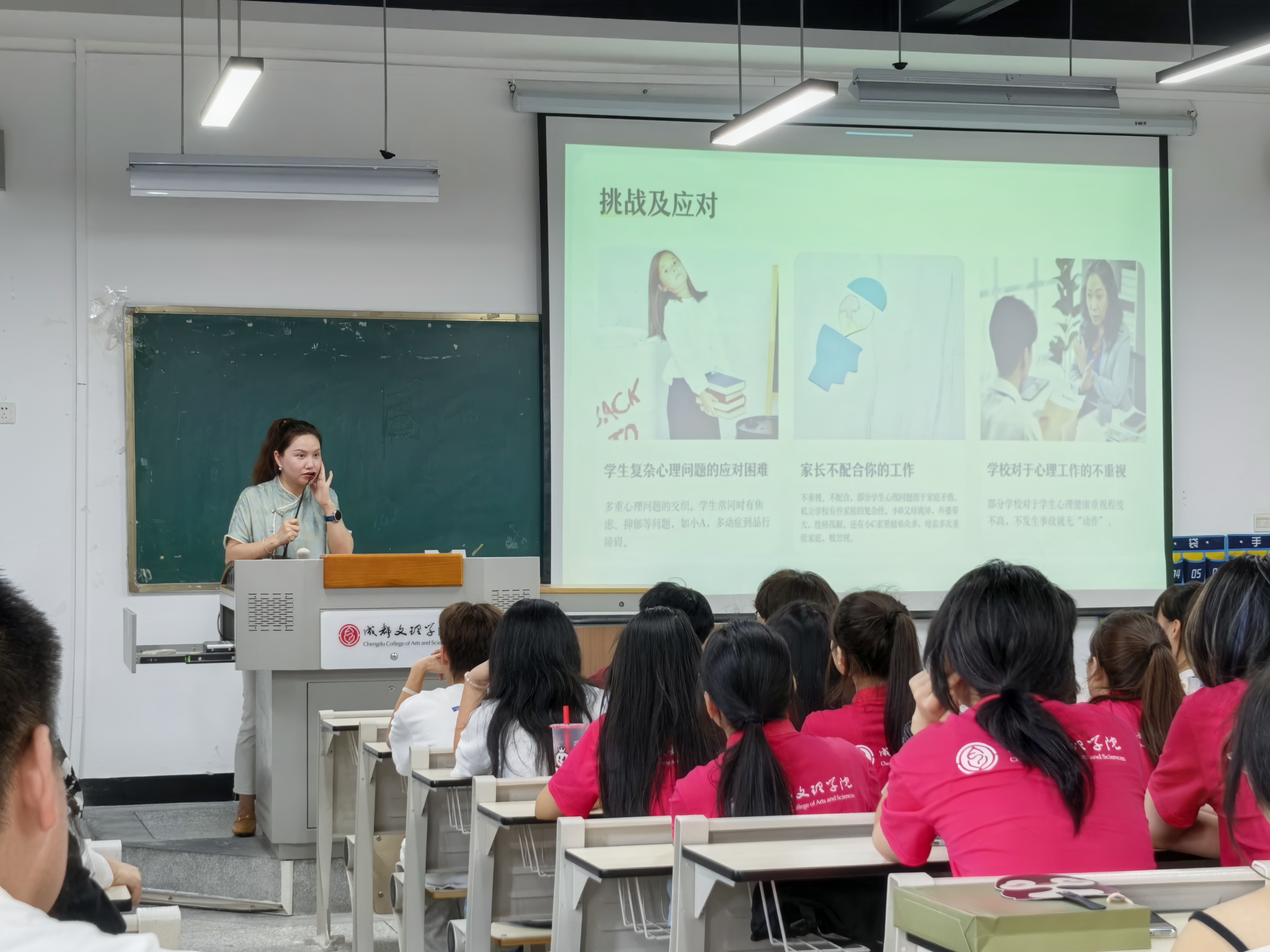 本次活动的重头戏——"行业专家面对面"座谈会将整个活动推向了高潮。座谈会特别邀请了成都市成华区嘉祥外国语学校教研组长、嘉祥集团心理中心组副组长龙丽老师作为行业专家进行专题分享。龙丽老师结合其在基础教育领域的丰富实践经验,从一线教育工作者的角度,深入浅出地阐述了应用心理学专业在中小学校园中的实际应用场景。她通过大量真实案例,详细介绍了学校心理健康教育的实施路径、心理课程研发的创新实践、学生心理危机干预的有效策略,以及家校协同育人机制的构建经验,为新生们展现了一个立体而真实的行业图景。