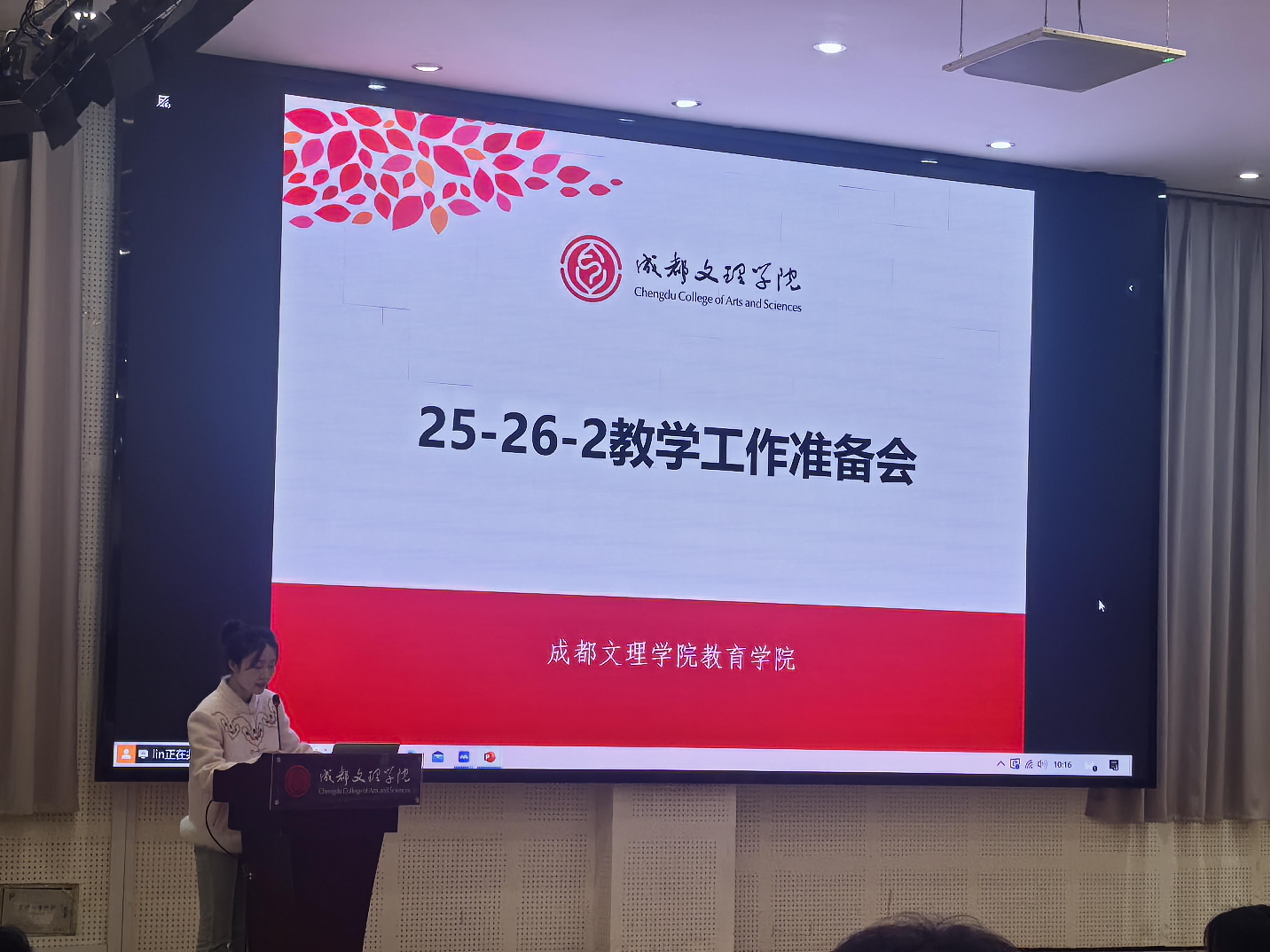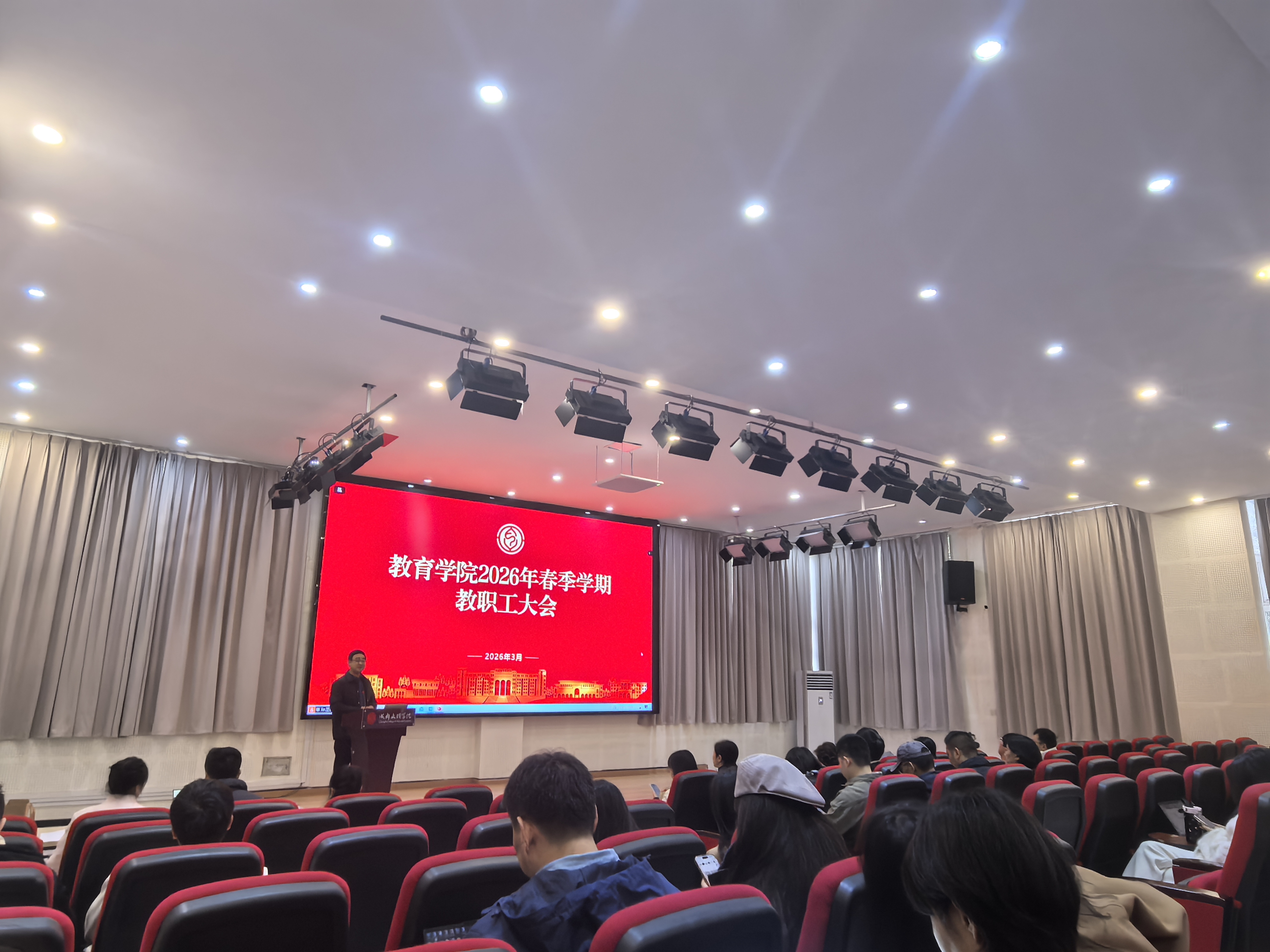 2026年3月1日上午,成都文理学院教育学院在学工部105会议室召开2026年春季学期开学教职工大会,总结回顾2025年工作情况,部署安排新学期重点工作。学院领导卢伟、舒彪、肖媛、王和琴、薛垲睿出席会议,全体教职工参加会议。主题讲话,各系主任、教研室负责人及全体教职工参会。