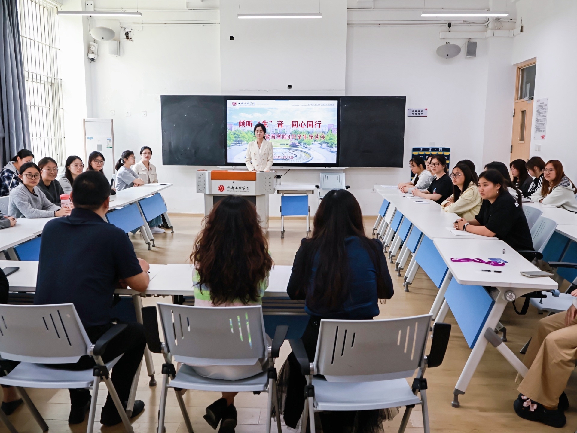 倾听“生”音,同心同行。为深入做好学院学风建设工作,了解学生学情现状以及学业难点痛点,有针对性的优化教学管理服务,教育学院于4月15日15:00在行政楼C109召开师生座谈会。教育学院党委书记舒彪、党委副书记兼学工办主任肖媛、辅导员与学生干部代表面对面交流。